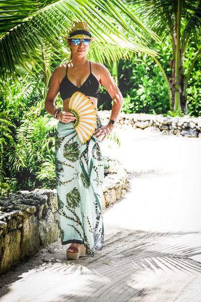 Romantic coral reef-inspired print beautifully arranged on sultry silk crêpe de chine. Our Sea Fan sarong in Celery Green billows on the beach in the afternoon then takes you into the night tied as a halter or one-shoulder dress for cocktail hour.